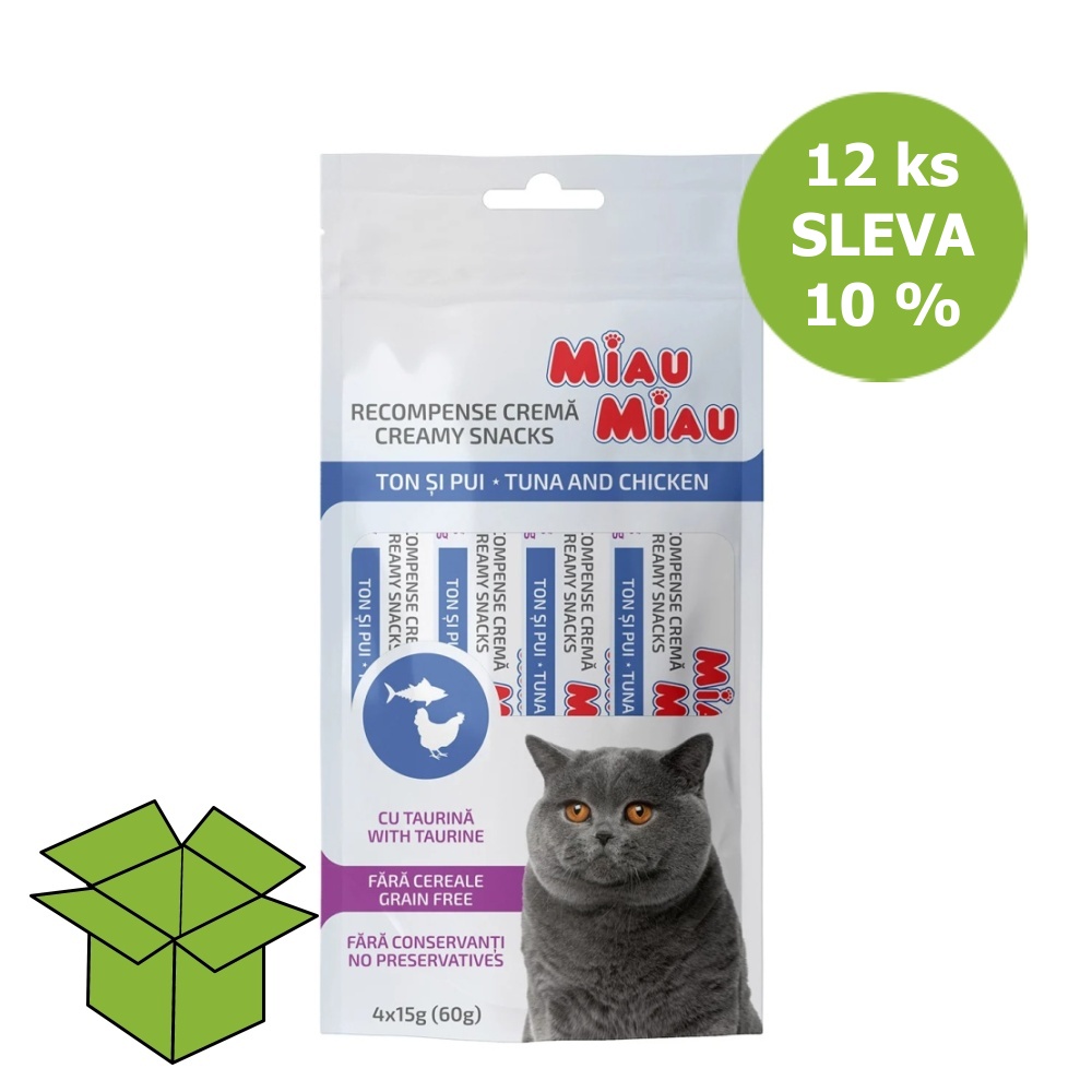 1 090 Kč – 2 090 KčMiau Miau Creamy Snacks Cat tuňák a kuřecí 15 g 4 pack (12 ks) SLEVA 10 %