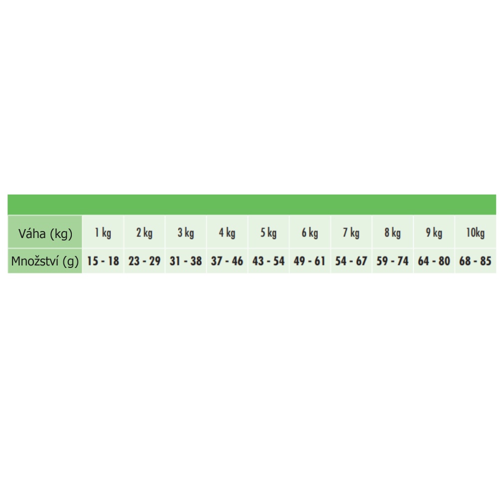 Složení: sušené živočišné bílkoviny (z toho kuřecí a krůtí 16 %), kukuřice* (23 %), pšeničné krupice, obilná mouka, hydrolyzované živočišné bílkoviny, kuřecí tuk, kukuřičný lepek, sušená dužina čekanky (1 %), hrášek* (0,2 %). * Přírodní složka.