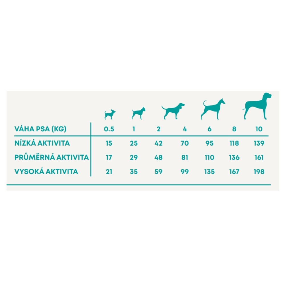 Krmný návod: změnu krmiva je třeba provádět postupně po dobu 7 dní. Jako návod použijte tabulku s dávkováním. Denní množství potravy se může pro každého psa lišit, záleží na úrovni jeho aktivity, plemeni a podmínkách prostředí. Denní krmnou dávku podávejte přednostně rozdělenou na 2 až 3 porce denně, a to vždy ve stejnou dobu. Pes musí mít vždy přístup k čisté, čerstvé vodě. Skladování: skladujte na chladném a suchém místě. Obal by měl být po použití vždy bezpečně uzavřen.