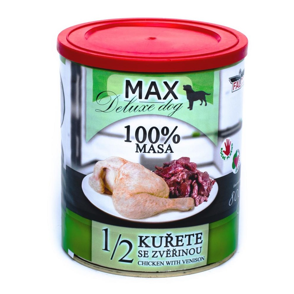 Nejlepší výběr kousků masa pro psy. Masová konzerva je naplněna ze 75 % celými kousky nasekaných kuřecích čtvrtek včetně kostí a 25 % zvěřinou.