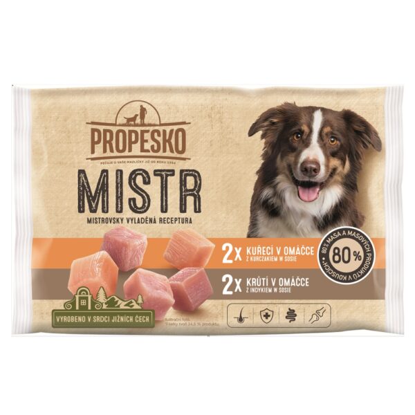 Kompletní mokré krmivo pro psy s kuřecím a krůtím masem v omáčce.