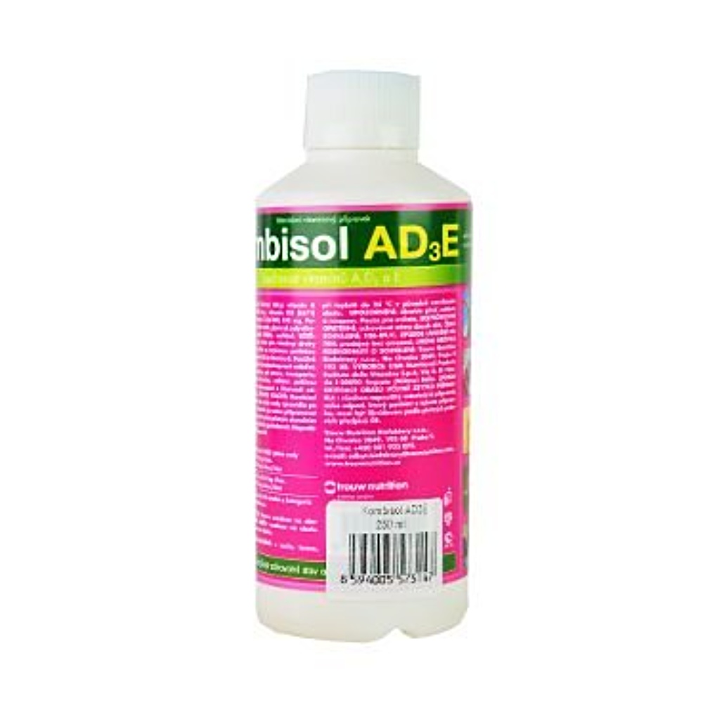 SLOŽENÍ: (Obsah účinných látek v 1 ml) Vitamin A 50 000 m.j. Vitamin E (alfa tokoferol) 100 mg Vitamin D3 10 000 m.j. INDIKACE: Podpora nespecifických imunitních procesů, zvýšení vitality mláďat, v období zvýšené fyziologické zátěže organismu zvířat, v období reprodukce, maximální užitkovosti, stresu, transportu, vakcinace a při sníženém příjmu krmiva v důsledku dietetických poruch nebo infekčních onemocnění, při náhlém poklesu snášky a snížené oplozenosti a líhnivosti násadových vajec a obecně při výskytu hypovitaminóz A, D, E. ZPŮSOB APLIKACE: Kombisol – AD3E se podává zvířatům řádně rozředěný v pitné vodě nebo mléce. Preventivně po dobu 5–10 dnů v uvedených dávkách. Aplikaci lze opakovat. Drůbeži je vhodné podávat po dobu 2–3 dní a zopakovat až po 2 měsících. Při léčebném podávání je možno dávkování zvýšit podle doporučení veterinárního lékaře. Současné podávání vitaminu D2 je nepřípustné. Rozředěný roztok je nutno chránit před přímým slunečním světlem a co nejrychleji spotřebovat. DÁVKOVÁNÍ: Pro drůbež: 80–160 ml/1 000 l pitné vody Slepice, kachna 20 ml/1 000 ks/1 den Krůta, husa 30–40 ml/1 000 ks/1 den Kuřata, kachňata, housata 1. týden stáří 5–7 ml/1 000 ks/1 den 2.–3. týden stáří 7–10 ml/1 000 ks/1 den 4.–6. týden stáří 10–14 ml/1 000 ks/1 den nad 6 týdnů stáří 20 ml/1 000 ks/1 den Krůťata 1.–2. týden stáří 8 ml/1 000 ks/1 den 3.–5. týden stáří 8–13 ml/1 000 ks/1 den 6.–10. týden stáří 13–17 ml/1 000 ks/1 den nad 10 týdnů stáří 17–25 ml/1 000 ks/1 den Holub 0,1 ml/15–20 ks/1 den Selata, jehňata, kůzlata (5 kg ž. hm.) 1 ml/40 ks/1 den Telata, hříbata (50 kg ž. hm.) 1 ml/8 ks/1 den Prasata (100 kg ž. hm.) 1 ml/4 ks/1 den Koně, skot (500 kg ž. hm.) 1 ml/1 ks/1 den DOBA POUŽITELNOSTI: 18 měsíců od data výroby.